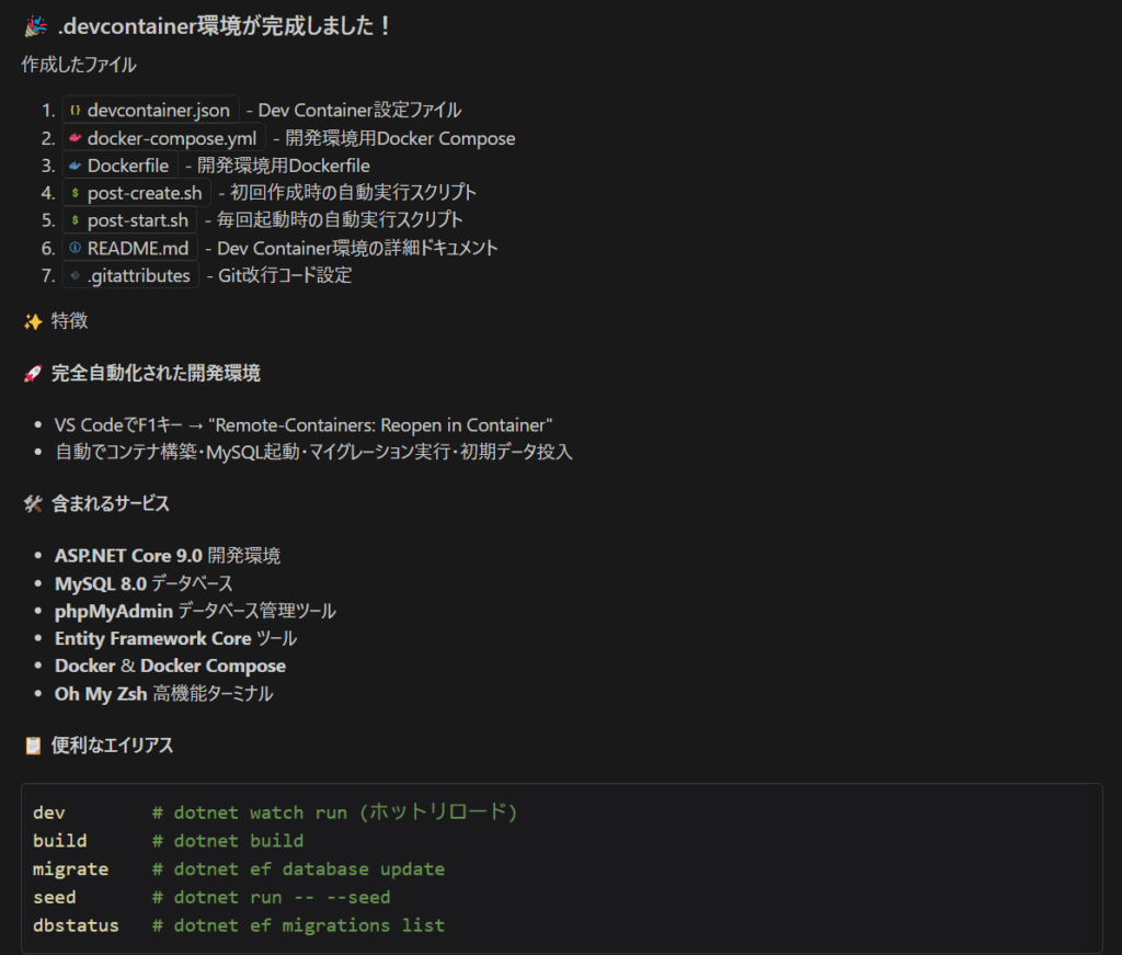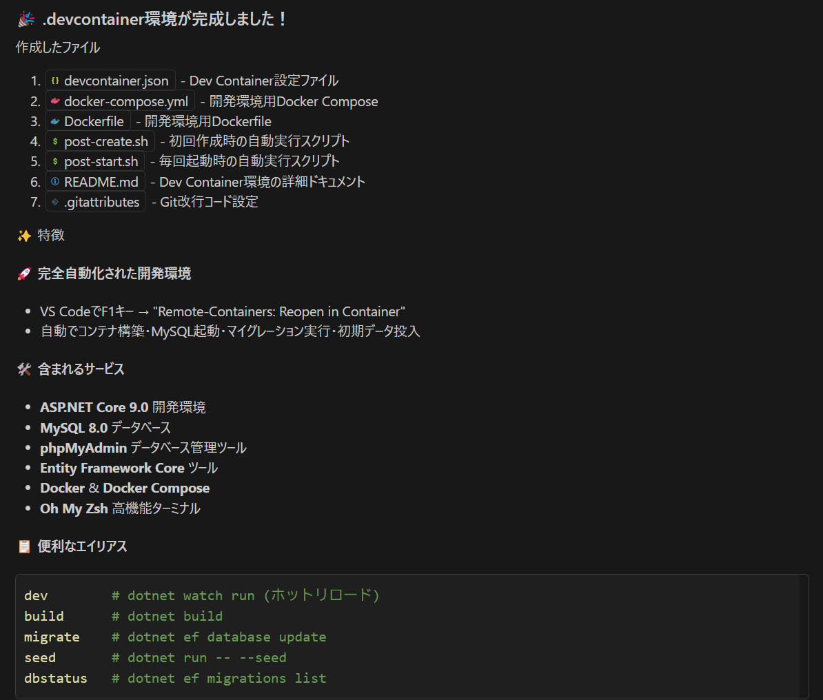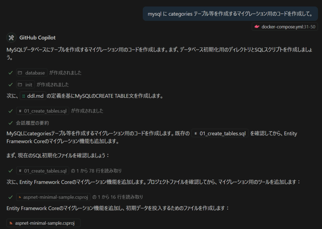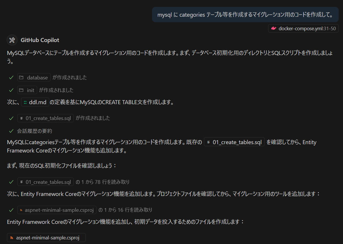 データベースを Docker 内に構築するので、テーブル定義からマイグレーション用のコードを生成します。以前ならば、何らかのツールか手作業で作成するところですが、これも一気に作ってくれます。