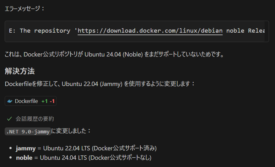 Dockerfile と docker-compose.yml なんて生成AIのモデルの中では十分に知見がありそうなものですが、何度やっても失敗します。仕方がないので手作業で修正をした後に Claude Sonnet にレビューして貰います。