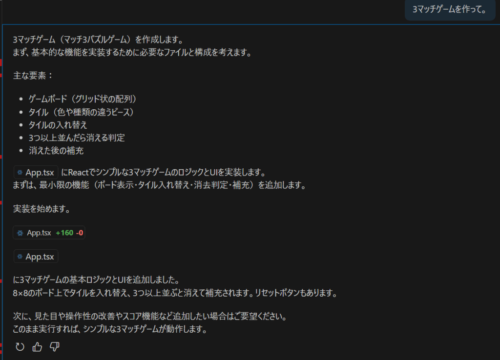 ちなみにプロンプトで「3マッチゲームを作って」と指示をしても同じコードが生成されるとは限りません。AI エージェントは生成 AI と同じように内部ではランダムな回答を出すようになっている(ことが多い)ので、生成されるコードもある程度ランダムになります。つまり、再現性が低いのです。