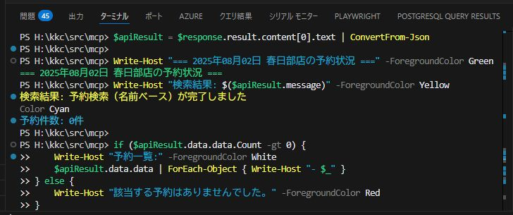 Chat が MCP Server を呼び出すときのコマンドを見ると解るのですが、jsonrpc 形式でリクエストを送信しています。vscode の Chat 部分で「2025年08月02日の「春日部」の予約状況を示して。」と入力すると、うまく JSON RPC 形式のリクエストに変換してくれることがわかります。このために、ユーザーは search_reservations_by_name などの関数名を意識することなく、自然言語を使って指示を与えるあるいは質問をすることができるのです。
