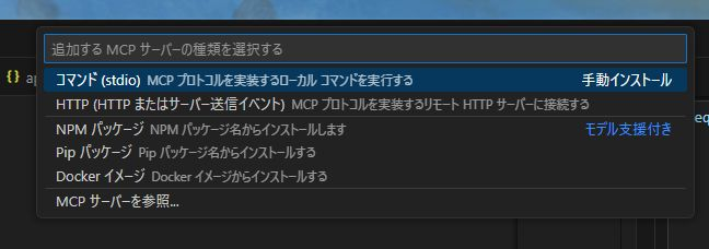 コマンドパレットで「MCP サーバーの追加」を見つけ出して、「コマンド(stdio)」か「HTTP」を選択します。