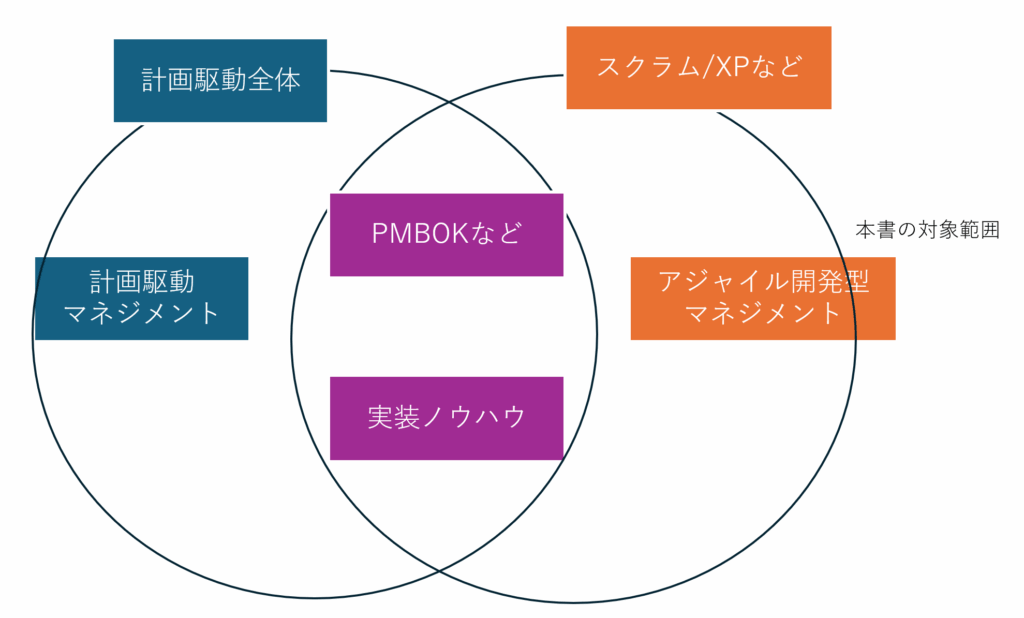 端的に言えば、Software Development 以外を記述した本(教科書的な)なので、ソフトウェア開発については SWBOK あたりを読め、という形になります。これをスタートラインとしているので、本書の範囲としては、右中央の「アジャイル開発型マネジメント」に絞っています。