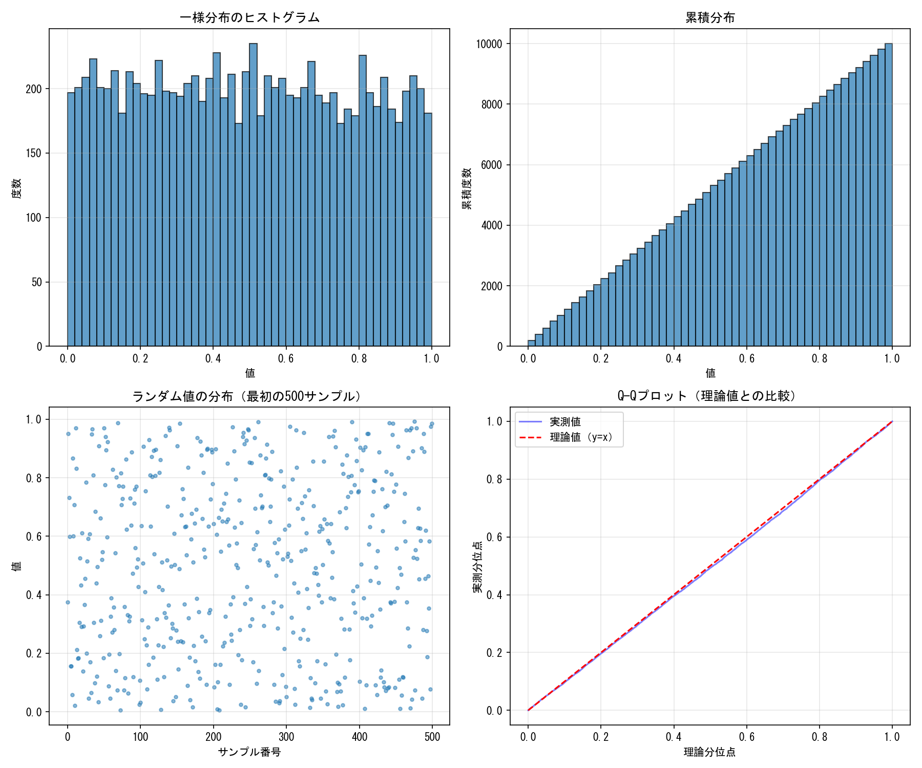 print(f'標準偏差: {np.std(uniform_values):.4f} (理論値: {1/np.sqrt(12):.4f})')