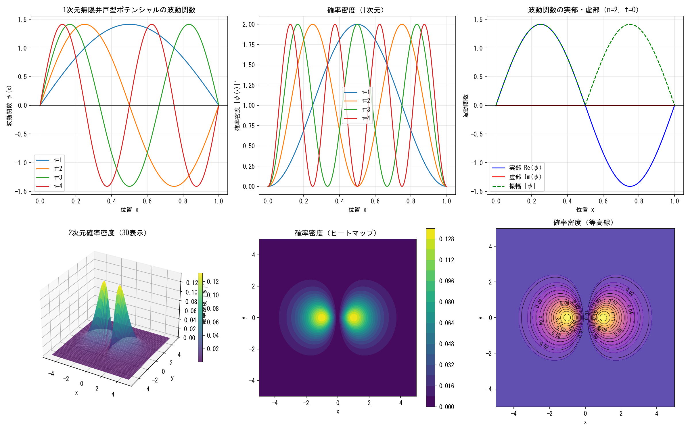 ax1.set_title('1次元無限井戸型ポテンシャルの波動関数')