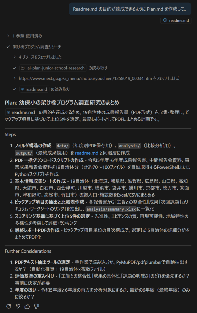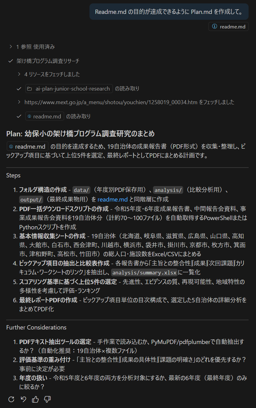 では、vscode + copilot を “plan” モードに切り替えて、データ収集とまとめのプランを立てて貰いましょう。