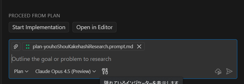 impliments とeditor があるので「editor」を選択しました。多分、impliments は即実行してしまうので危ういです。いったん editor で plan.prompt.md を確認しておきましょう。