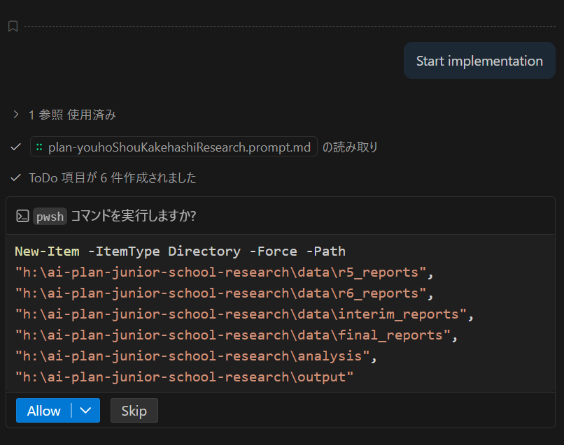 フォルダーの構成とかを作ってくれますね。このあたり、非IT業界だと日本語で作るところですが、IT屋さんとしては Python をあたりを使って自動化したいところなので、このまま使います。多分、フォルダ構成を日本語に直しても AI エージェントのほうでうまくやってくれるはずです。