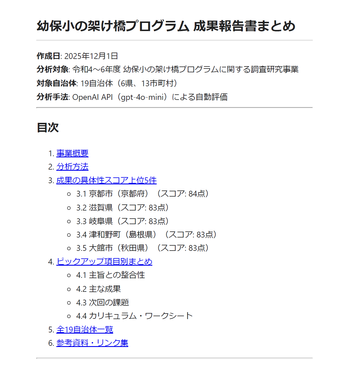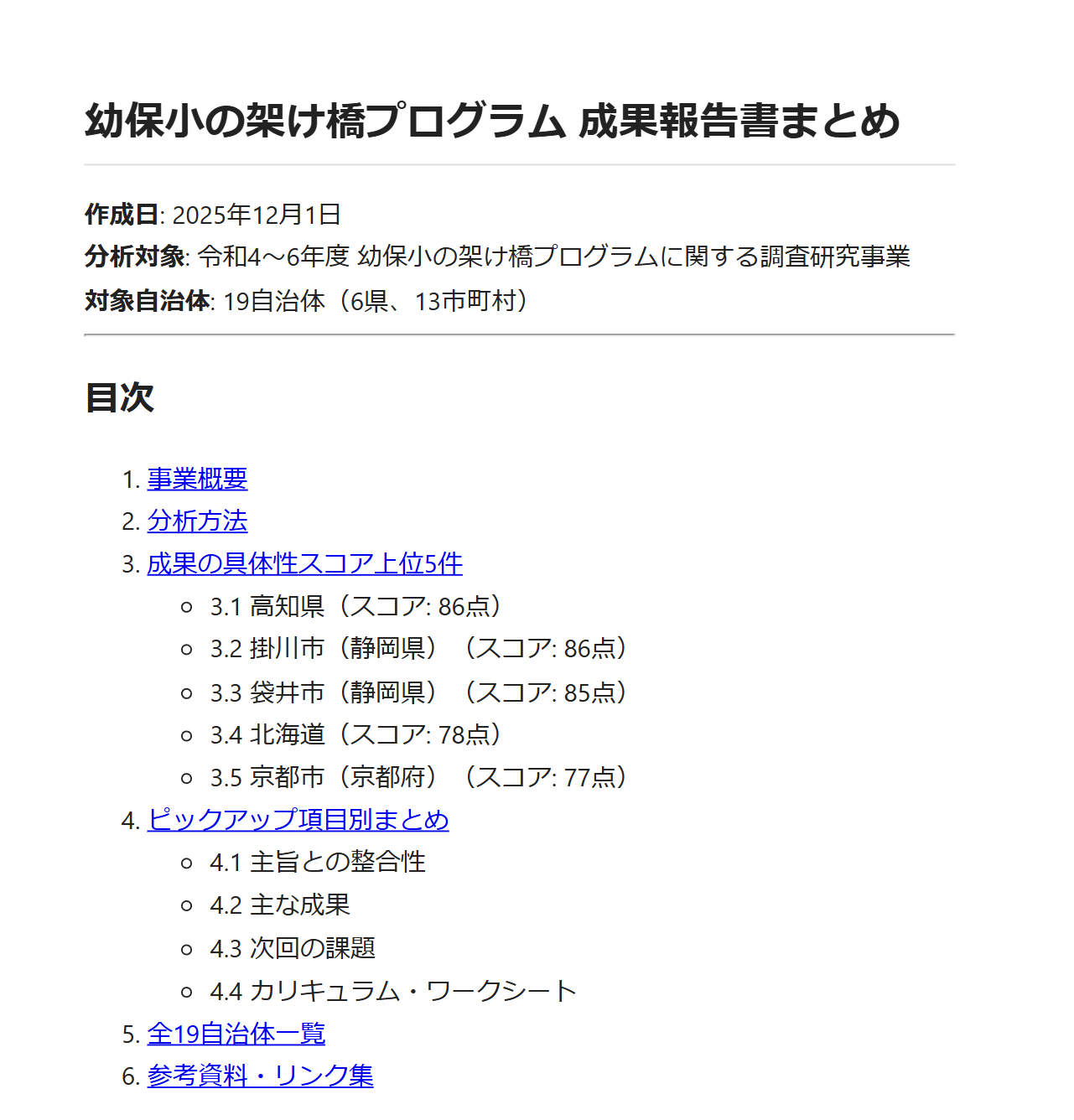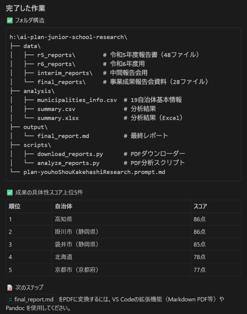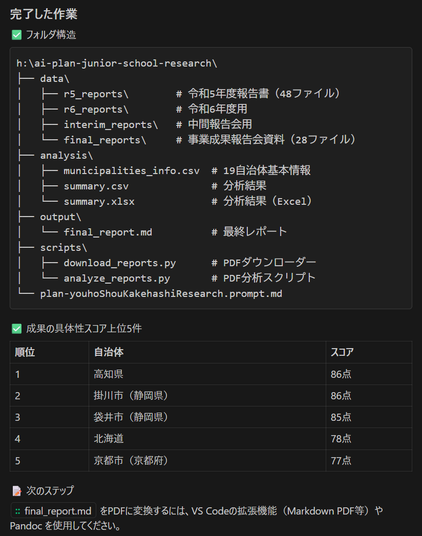 readme.md の目的を達成するため、19自治体の成果報告書(PDF形式)を収集・整理し、ピックアップ項目に基づいて上位5件を選定、最終レポートとしてPDFにまとめる計画です。