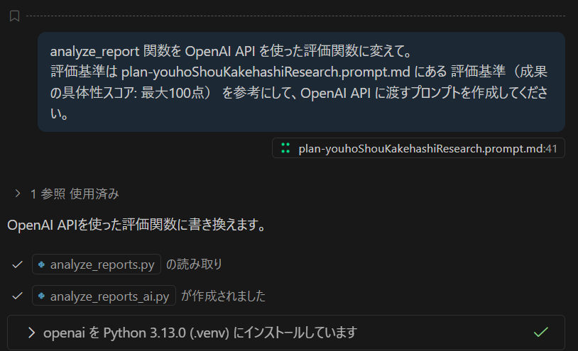 この内容を OpenAI のプロンプトと成果物の文書を一緒に渡して、評価結果を返して貰う事になります。以前は、システムプロンプトを作ったり、OpenAI API を呼び出す関数を作ったりと色々大変でしたが、いまでは AI エージェントが適切なコードを作ってくれます。