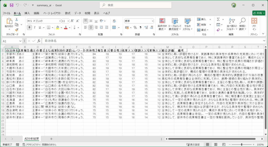 レポートを見ると、分析手法が書いてあります。成果の具体性スコアも変わっています。これれは、実際に報告書を読んで人間が判断する必要があります。