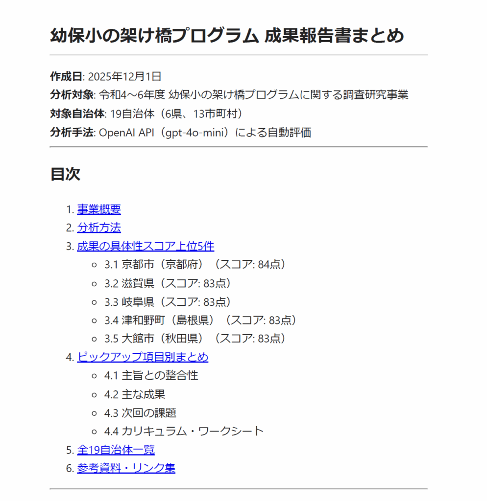 6. **最終レポートPDFの作成** - ピックアップ項目単位の目次構成で、選定した5自治体の詳細分析をまとめてPDF化