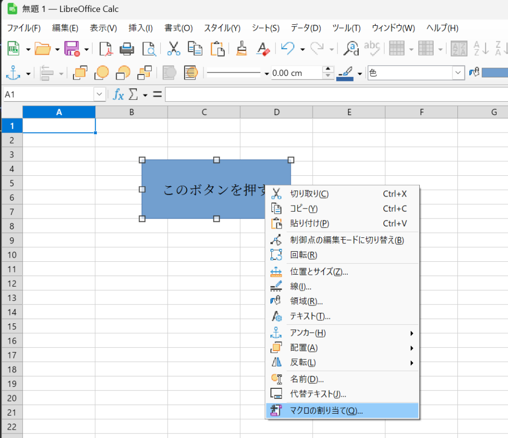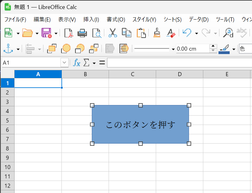 まず、Calc にボタンを配置します。「ボタン」というのがないんで、四角の Shape を使っています。