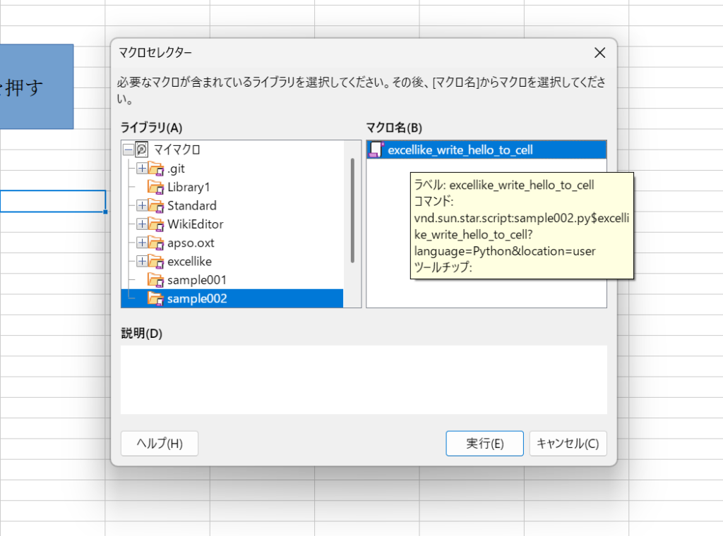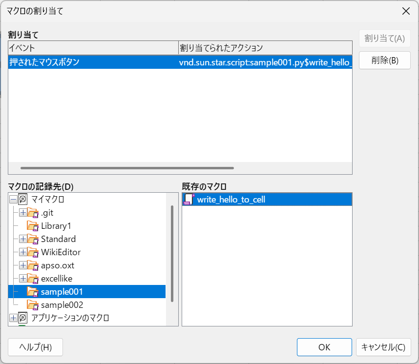 マイマクロの中から目的の Python 関数を選んで(ここでは sample001.py にある write_hello_to_cell 関数)ダブルクリックします。ここで割り当てができます。