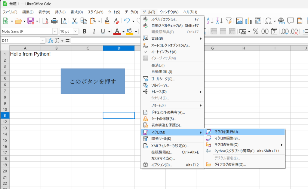 Python が LibreOffice のものに固定されているため pip などのライブラリ追加がうまくいかないかもしれません。このあたりは、後で調べてみるのですが、バージョンとしては 3.11.14 なので、それなりに使えるでしょう。Python に詳しくないのでよくわからないのですが。