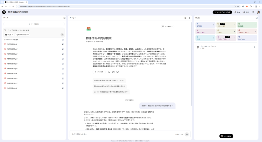 ひとまず、NotebookLM で必要そうなファイルを突っ込んでみて、何か質問してみると、きっちりと PDF ファイルの内容を理解して回答してくれることがわかります。抜き出しだけではなくて、箇条書きでまとめたり表形式にフォーマットしなおしたりすることも可能です。