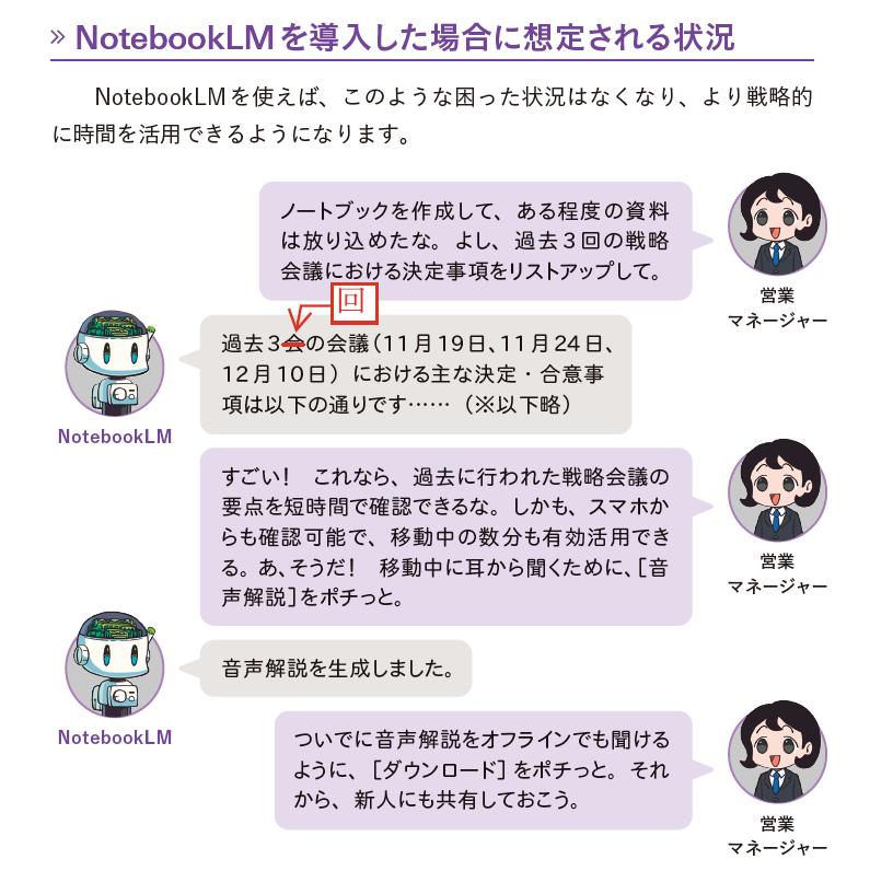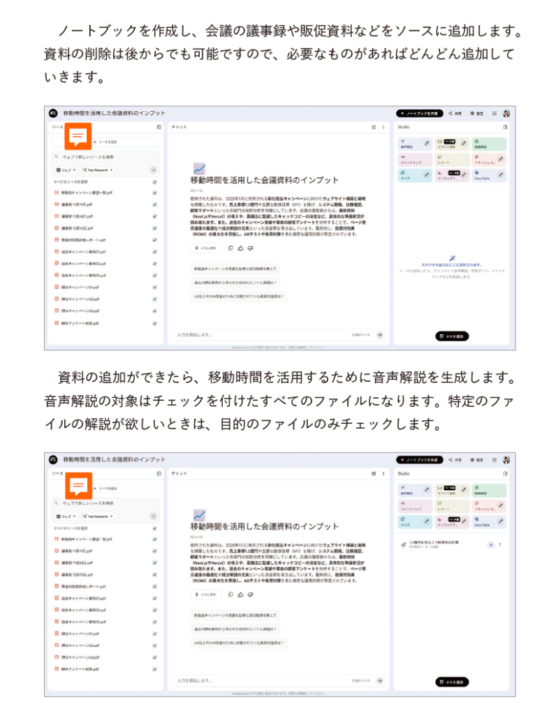 想定する職業はばらばらなので、自分の職種とは違うものが多いとは思うのですが、使い方のヒントにはなると思います。特に、手元に PDF やテキストデータ、Word ファイルなどで情報が文書として残っている場合は、お得に NotebookLM を活用できます。