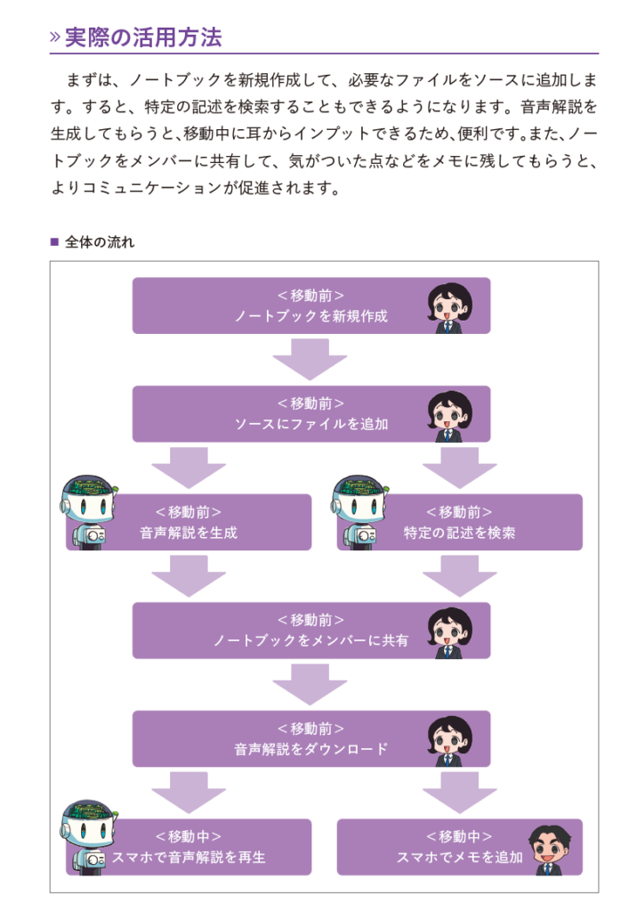 その後に、フローチャート方式で、NotebookLM がどこで活用されるのか確認します。