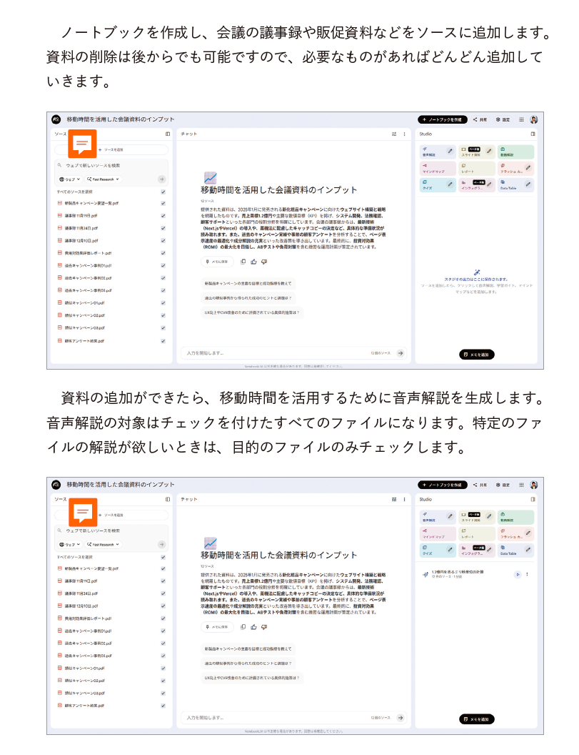 なんとなく理解できたら、実際に NotebookLM にサンプル文書をいれて動かしてみましょう。というスタイルになっています。