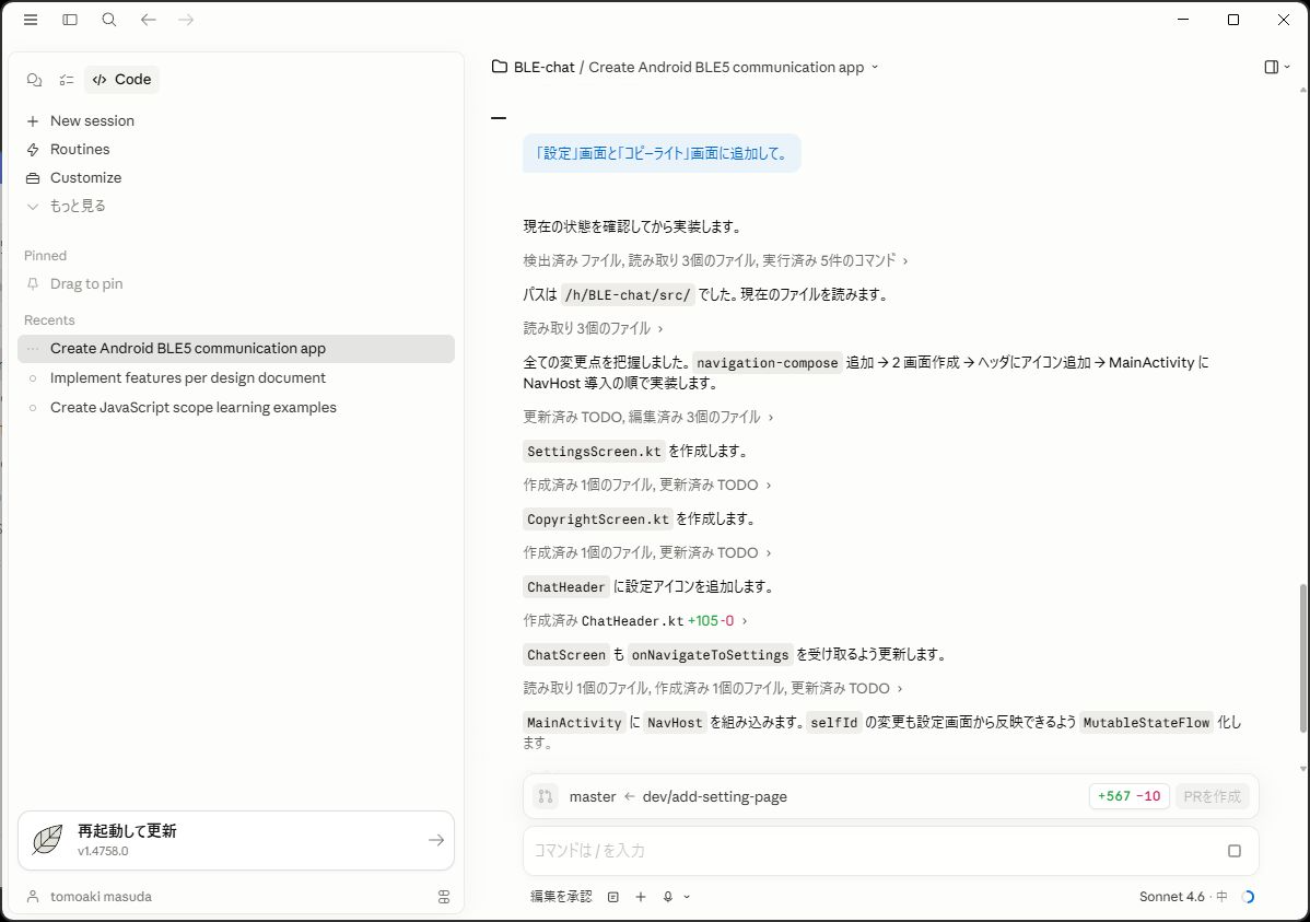 このあたり、設定用の画面とコピーライト用の画面を設計するところなのですが、このあたりの定番の画面ならば雑に追加しても大丈夫であろうということで、agents/ に .md ファイルを作るのではなく、プロンプトで指定してみます。Android アプリの画面の追加は FolkBears で経験済みなので、そこそこうまく追加してくれるはずです。