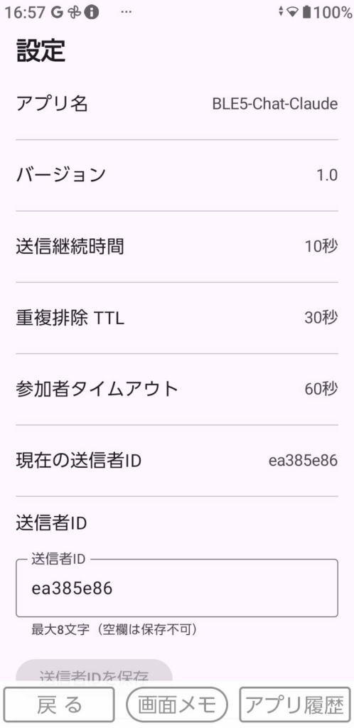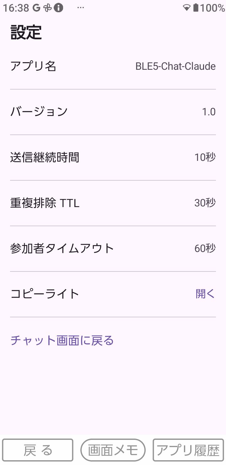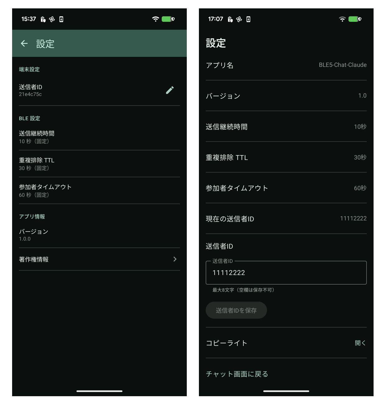 この他に、BLE の設定値として、送信継続時間や重複排除 TTLなどがありますが、これは SettingsScreen.kt に直が気になっています。