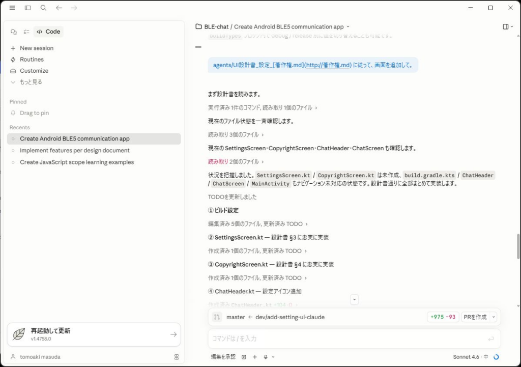実に Claude Code と同じ画面ができあがります…が、右上の歯車ボタンが「・・・」になっているのが、ちょっと違いますね。画面遷移自体は「設定」→「著作権表示」となっているのですが。