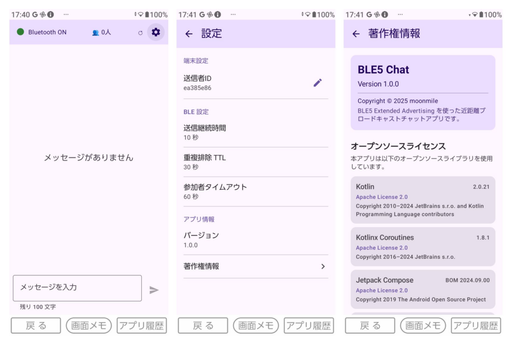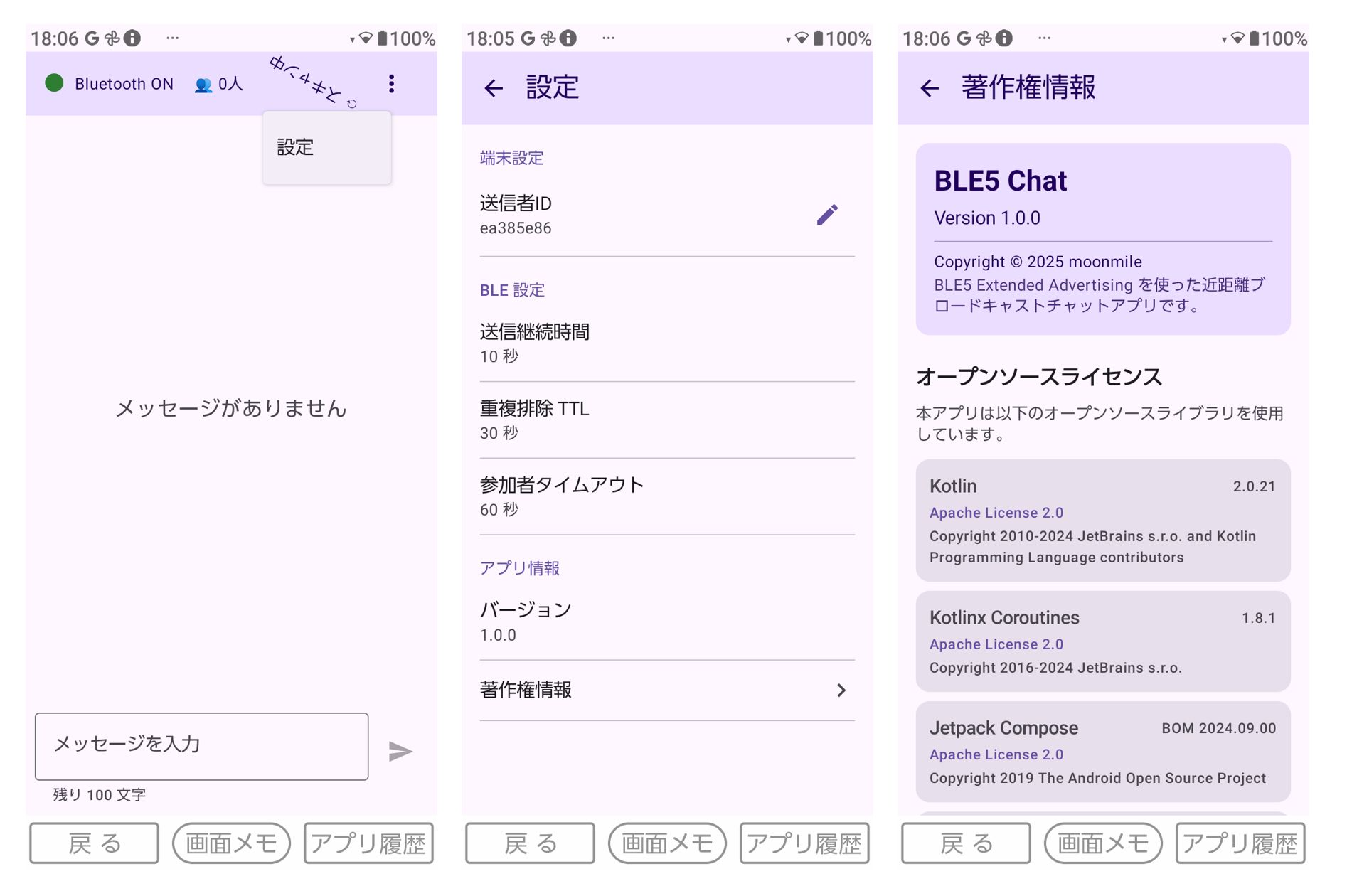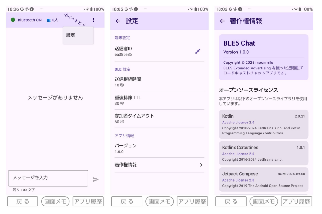再びコードをもとに戻して、BLE-chat ツールに「設定」と「著作権表示」の画面を追加してみます。