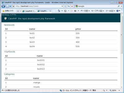 複数の Model(NewGoods,YourGoods,Categories)を、コントローラー GoodsController でひとまとめにして、ビューで表示させるという方式です。