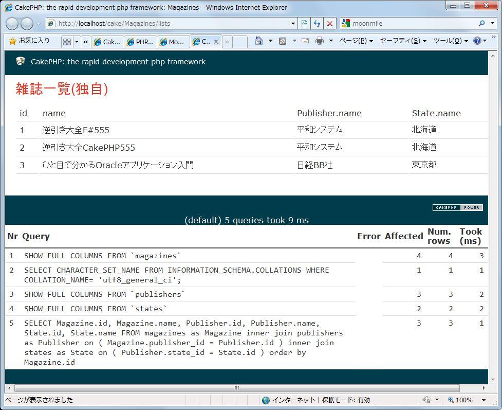 <!-- views/magazines/lists.ctp --> <h2>雑誌一覧(独自)</h2> <table> <tr> <td>id</td> <td>name</td> <td>Publisher.name</td> <td>State.name</td> </tr> <?php foreach($MagazineLists as $item) : ?> <tr> <td><?php echo $item['Magazine']['id'] ?></td> <td><?php echo $item['Magazine']['name'] ?></td> <td><?php echo $item['Publisher']['name'] ?></td> <td><?php echo $item['State']['name'] ?></td> </tr> <?php endforeach ; ?> </table>