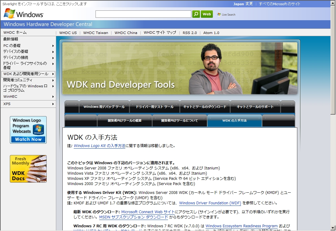 WDKの入手先は、Microsoft Connect Web サイト か MSDN サブスクリプションとなっています。が、私の見た限り MSDN サブスクリプションには WDK が無い(?) ので、Microsoft Connect Web サイトのほうでダウンロードしました。
