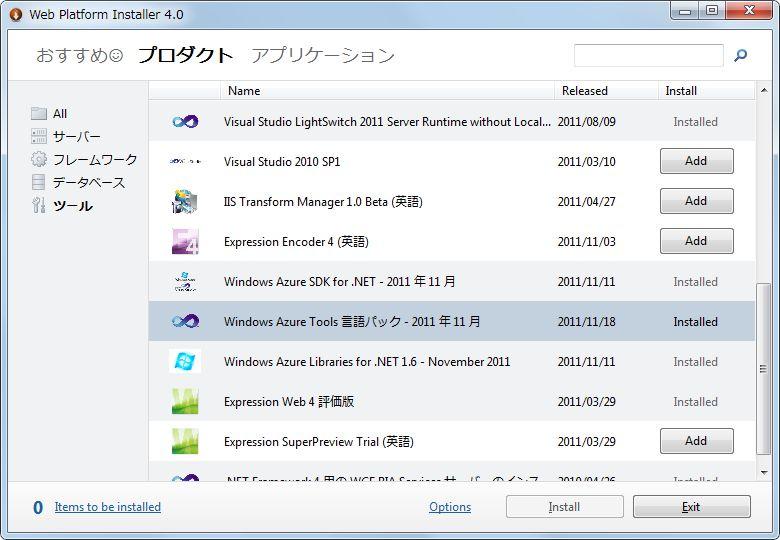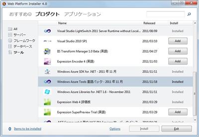 以前は、MSDN のダウンロードを探し回らなくては駄目だったのですが、今回は Web Platform Installer から検索するとすんなりいけそうです。「windows azure」で検索すると出てきます。