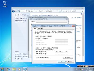 コントロールパネルから、「ネットワークの状態とタスクの表示」を開いて「ローカルエリア接続」を選択して、優先 DNS サーバーで、ドメインサーバー兼 DNS サーバーの固定 IP を指定する。