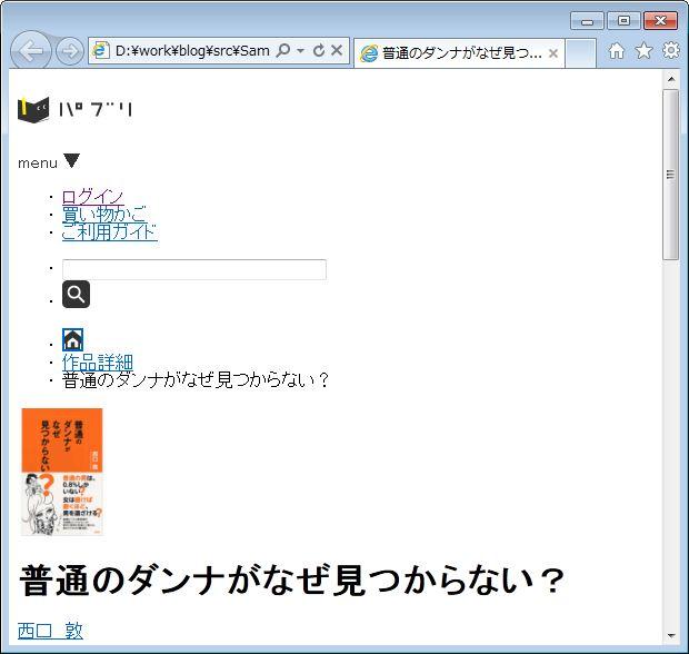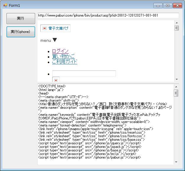 さて、なぜ iphone 専用のサイトを pc から覗く必要があるかというと、hon.jp の api を利用して amazon 風のブログパーツを作りたいからなのです。amazon ブログパーツは、書籍の画像を返してくれるのですが、hon.jp api は、画像を返してくれません。hon.jp の場合、タイトル検索などのテキスト検索が主なので、電子書籍の画像は各社のサイトの中にしかありません。pc 用の電子書籍がある場合は、pc からキャッシュ的に取得すればよいのですが、iphone 用しかない場合には、iphone 用のページにアクセスする必要があります。なので、画像を取得するためには iphone であると偽装して画像用の url を取得しないと駄目なのです。