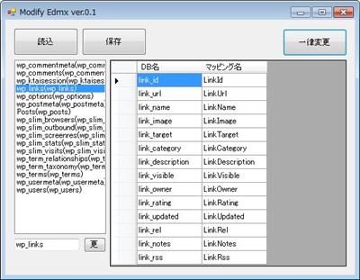 左上の「一律変更」ボタンをクリックすると、.NET 標準の upper camel calse に変換します。「post_id」だったら「PostId」という具合ですね。カラム名をひとつずつ変換することもできます。