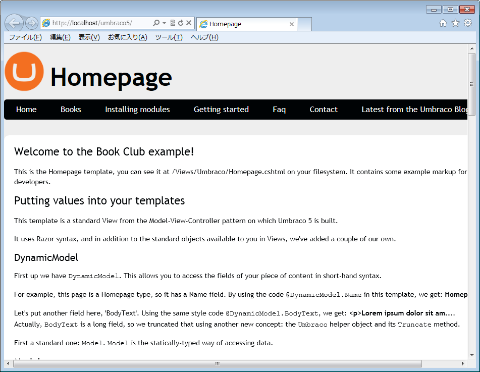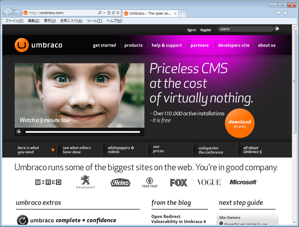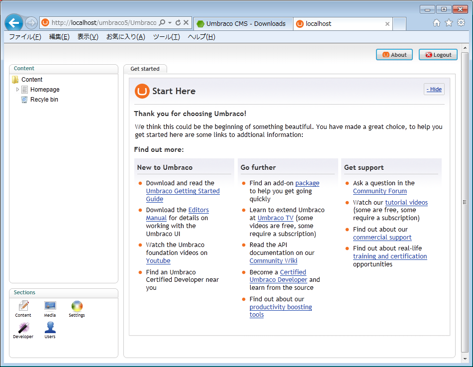 が、Umbraco – The open source ASP.NET CMS というのがあって、この ver.5 のほうは、asp.net mvc ベースで書き変えられているということなので、これはいいかなぁと思って、ひとまずローカルの IIS にインストールしてみましょう…ってのインストール記録ですね。