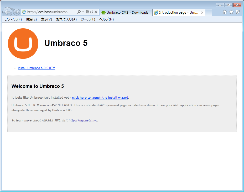 「Install Umbraco 5.0.0 RTM」をクリックします。(click here も同じ)