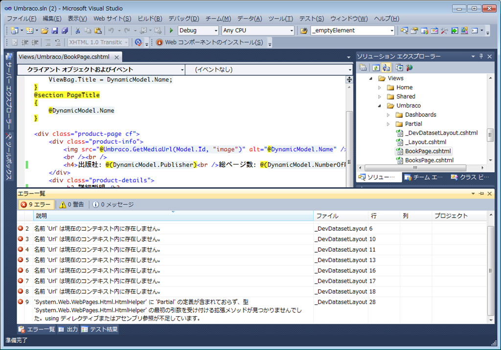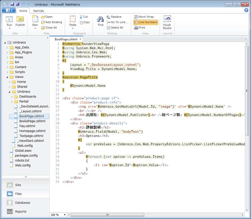 Views/Umbraco/BookPages.cshtml を開くと、Razor で書かれていることが分かります。