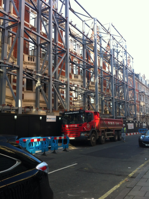 大学の頃に旅行したイタリアと同じく、ロンドンの街は古い建物が満載です。あたかも、シャーロックホームズの映画の中にいるように、その当時の建物が目の前にあります。地震がないのでできる技なのですが、建物自体の持久力は?ということと、中身をホテルやアパートに改造するときに、そのまま使うには不便ではないだろうか?と常々思っていたのですが、実は下の写真のように表の外壁だけを残して裏側全体を改築してしまうようです。