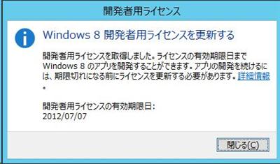 良く見ると有効期限が「2012/07/07」になっていますね。今日が「2012/06/07」なので、丁度1ヶ月の有効期限となっているのです。1か月後にどうなるかというと、単に最初の開発ライセンスを要求するダイアログが出るだけです。再び、Windows live Id を入力して登録すれば ok です。「期限切れになる前に~」と書かれていますが、期限が切れてしまった場合でも最初に起動すると「開発ライセンス」を要求されるので大丈夫です。ただ、その時にネットワークに繋がっていないと、(多分)ライセンスの更新ができなくてアプリを起動できないってことになるので、ノートブックにインストールしている場合は早めに更新しておくのが吉かと。