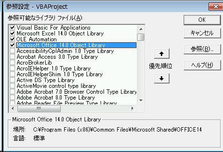 Excel VBA を立ち上げて、「ツール」→「参照設定」を開きます。