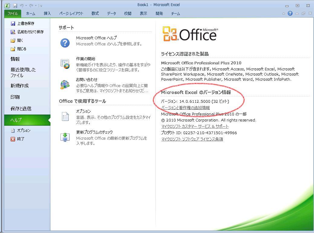 一応 Excel 2010 を確認しておくと、「ファイル」→「ヘルプ」から 32ビット版なのか 64ビット版なのかが分かります。