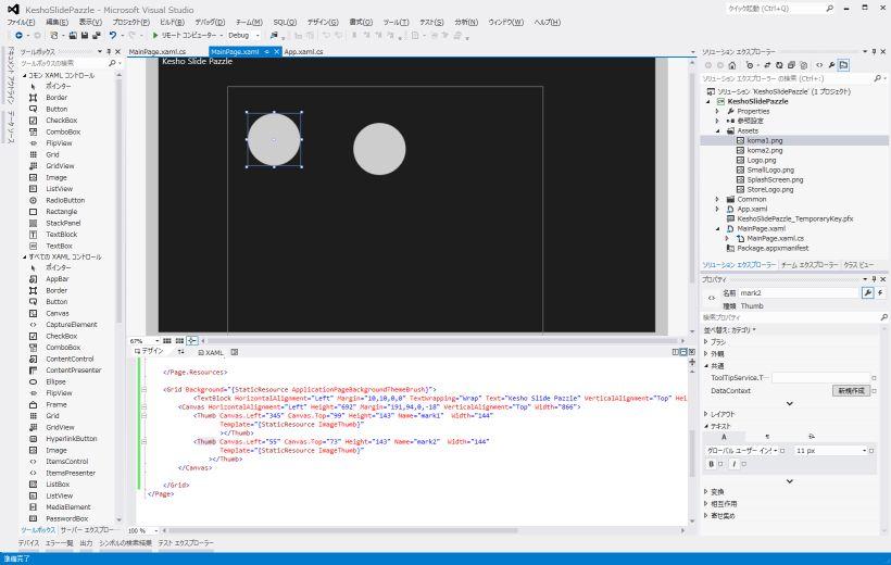 Thumb コントロール自体には背景が指定できないので、内部で Grid を作ってその中に Ellipse のような図形のコントロールを配置するのがミソですね。このあたり、もう少しゲームっぽい動きができたら、Windows Store app のサンプルに上げておきます。