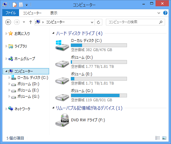 という構成。SSD は、Plextor PX-512M5P を使い、HDD は好みの関係から W.D WD20EZRX SATA3 2TB を 2 台。G ドライブは、日立のものです(まあ、今となっては一緒なんですが)。