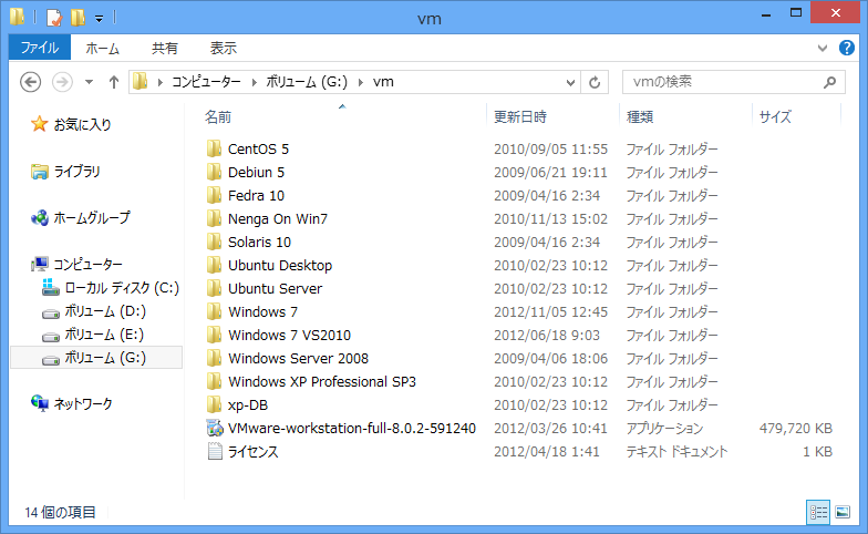 VMWare のほうは、こんな風に Linux やら、Windows XP やらいくつかのバージョンを用意しておきます。いくつか容量が足りなくて処分してしまったのですが、Windows XP の SP1 などを残して検証用に使います。あとは、開発環境(Visual Studio 2008)とソースコードを入れ込んで、いつでも復活できるようにするとか、そういう使い方をします。これも HDD を別にしておくことで、新しい PC に即換装ができるということです。まあ、コピーしても1昼夜かければ、大丈夫ですが。これもクラッシュに備えるとうことで。