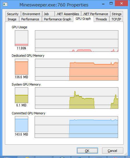 確実に GPU 上で動いているであろうマインスイーパーを動かすと、こんな感じで GPU が動いていることがわかります。Comit 量も多いので、グラフィックボードを入れる価値があった、ってところですね。グラフィックがオンボードの場合は、どうなるのか確認していませんが…、ひとまず、GPU がMinesweeper.exe では使われていることが確認できます。ええ、所詮マインスイーパーなんですが(苦笑)。