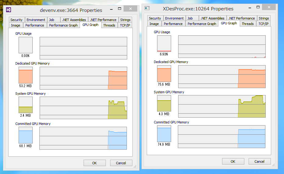 Visual Studio 2012 本体と、XAML デザイナの関係も同じで、ぐりぐりと XAML デザイナで編集しているときには GPU を使っています。また、Visual Studio 2012 本体のメニューをいじっているときは、本体側の GPU が使われます。