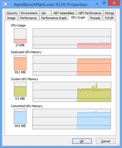 Process Explorer で XamlBenchMark の負荷をみていくと、GPU を 25% ほど使った状態になります。この PC だとそれほど重くないのですが、うまく動かない場合は、1000 個位に減らして動かしてみてください。