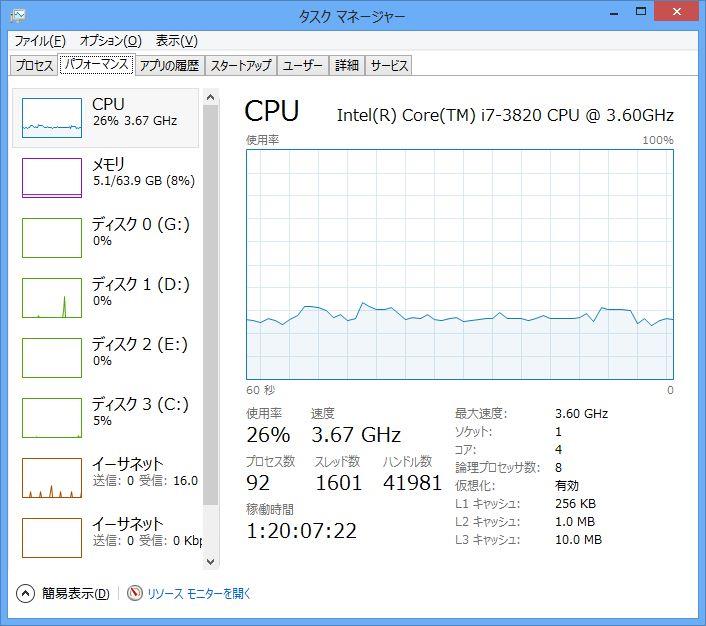 この時の CPU 負荷は、26% 程度です。GPU を使わない場合(グラフィックボードを積まない場合)がどうなるのかは、別の PC で検証したいと思います。