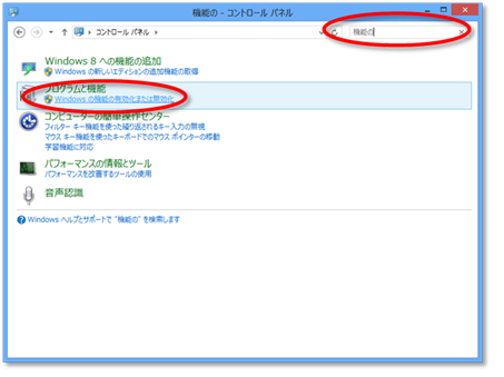 時々忘れるので、簡単に手順を書いておきます。コントロールパネルを開いて、「Windows の機能の有効化または無効化」を開きます。左上の検索ボックスで「機能の」とか打てばokです。
