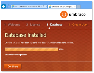 データベースのインストールが完了。Continue をクリック。