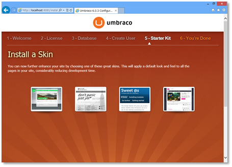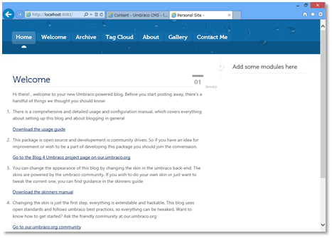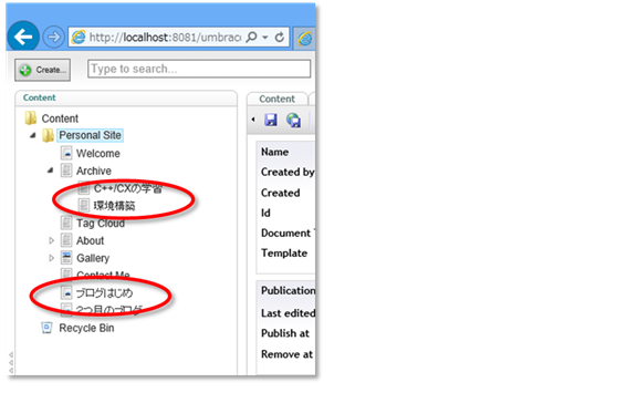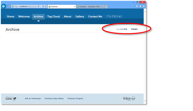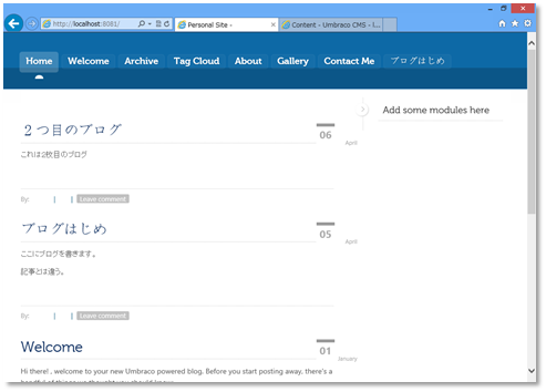 管理画面は、http://localhost:8081/umbraco を開けばokです。スキンには「管理」へのリンクがないので、戸惑います。Wordpressのように「サイト管理」を表につけておいたほうが良いかも。